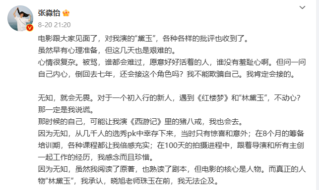 8月20日,张淼怡发长文进行回应。她表示看到各种各样的批评心情很复杂,但倒回去七年前还是会接这个角色,也承认“晓旭老师珠玉在前,我无法企及”,“这七年,我演了更多的角色之后,我知道自己的问题所在。我也相信自己正在变得更好,也会让自己努力去做到更好。”她还称自己最对不起的是胡玫导演在电影里倾注的心血,“林黛玉这个角色,我会永远记住,也会永远鞭策自己。”
