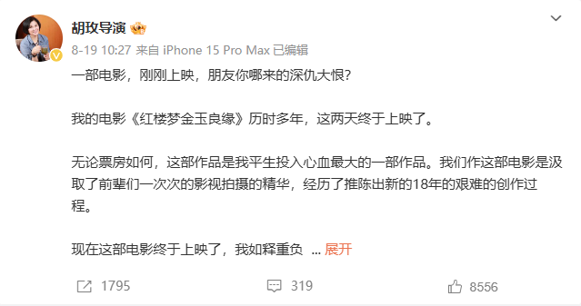 8月19日,导演胡玫在个人社交媒体平台上就其执导的电影《红楼梦金玉良缘》发表长文,隔空质问:“一部电影,刚刚上映,朋友你哪来的深仇大恨?” 她在文中称: “无论票房如何,这部作品是我平生投入心血最大的一部作品。我这部电影是汲取了前辈们一次次的影视拍摄的精华,经历了推陈出新的18年的艰难的创作过程。”