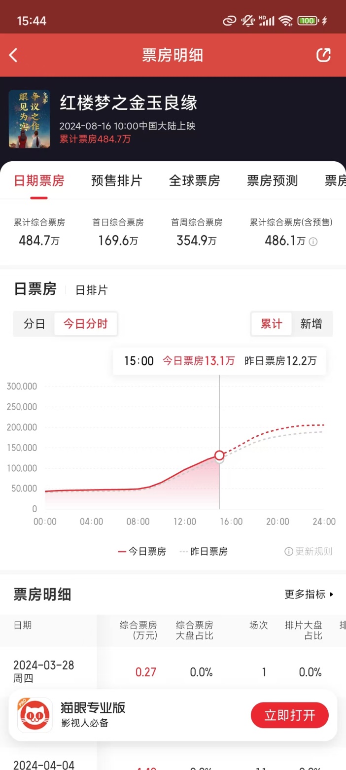 猫眼电影专业版显示,截至8月22日15时,上映第7天的《红楼梦之金玉良缘》总票房为484.1万元,预测总票房为608.1万元。目前该电影豆瓣评分还未开分,但短评已有6000多条,以差评为主。而据导演胡玫透露,电影中的古董装饰全都是真品,总价值约六七十亿。从票房表现来看,要收回成本恐怕并不容易。