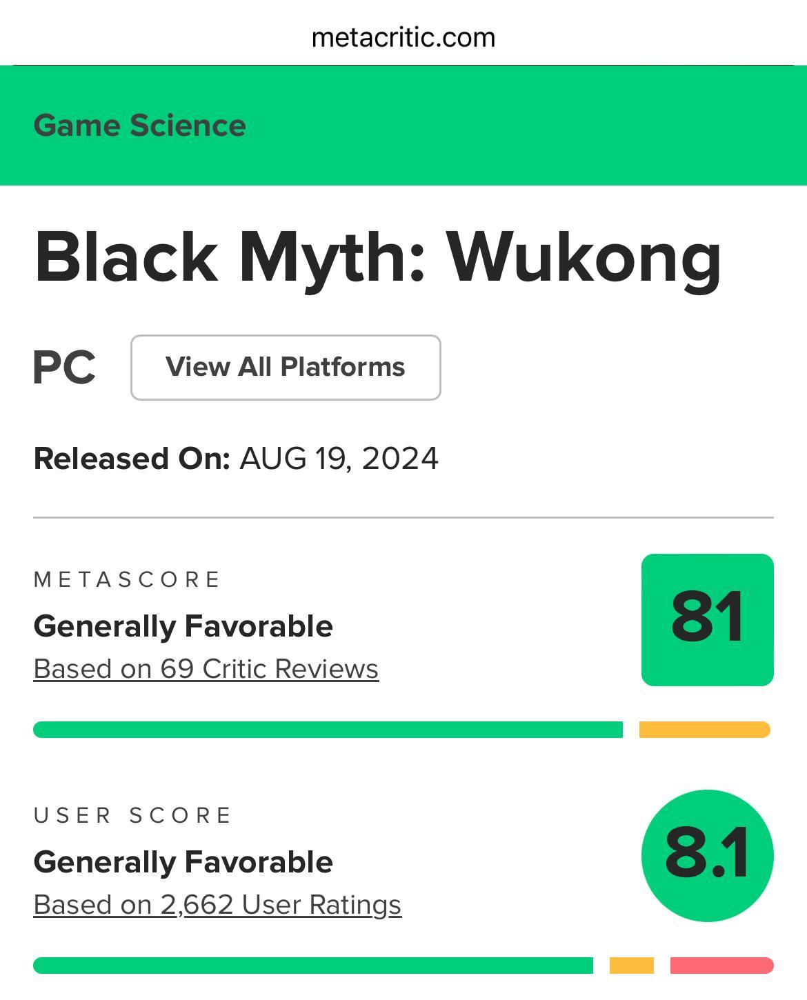 根据媒体评分聚合网站metacritic统计,目前已有的69条评论给《黑神话:悟空》PC端打出的均分是81分