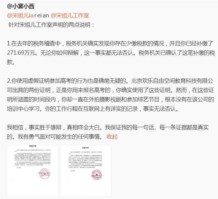 8月27日至28日,宋祖儿工作室连发两条声明,否认宋祖儿偷税漏税及高考舞弊。对此,此前发文爆料的博主回应称,保证每一句话、每一条证据都是真实的。