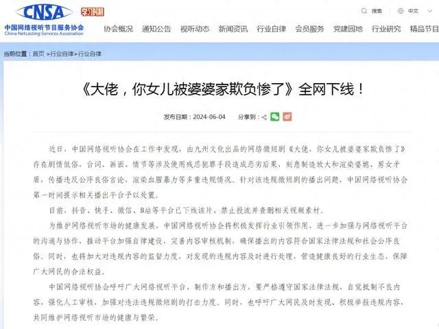 中国网络视听协会呼吁广大网络视听平台、制作方和播出方,要严格遵守国家法律法规,自觉抵制不良内容,强化人工审核,加强对违法违规微短剧的打击力度。同时,也呼吁广大网民及时发现、积极举报违规内容,共同维护网络视听市场的健康与繁荣。