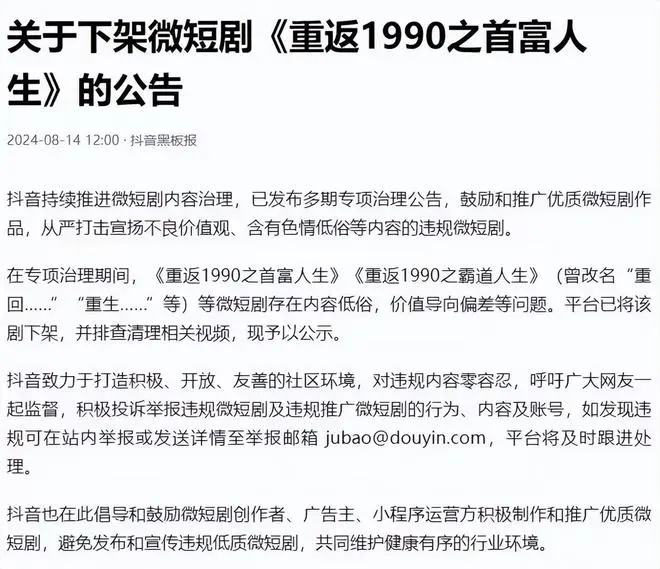 微短剧并非首次被曝存在乱象,此前,《重返1990之首富人生》《重返1990之霸道人生》等微短剧,因存在内容低俗、价值导向偏差等问题,相关作品及违规片段被全网下线。
