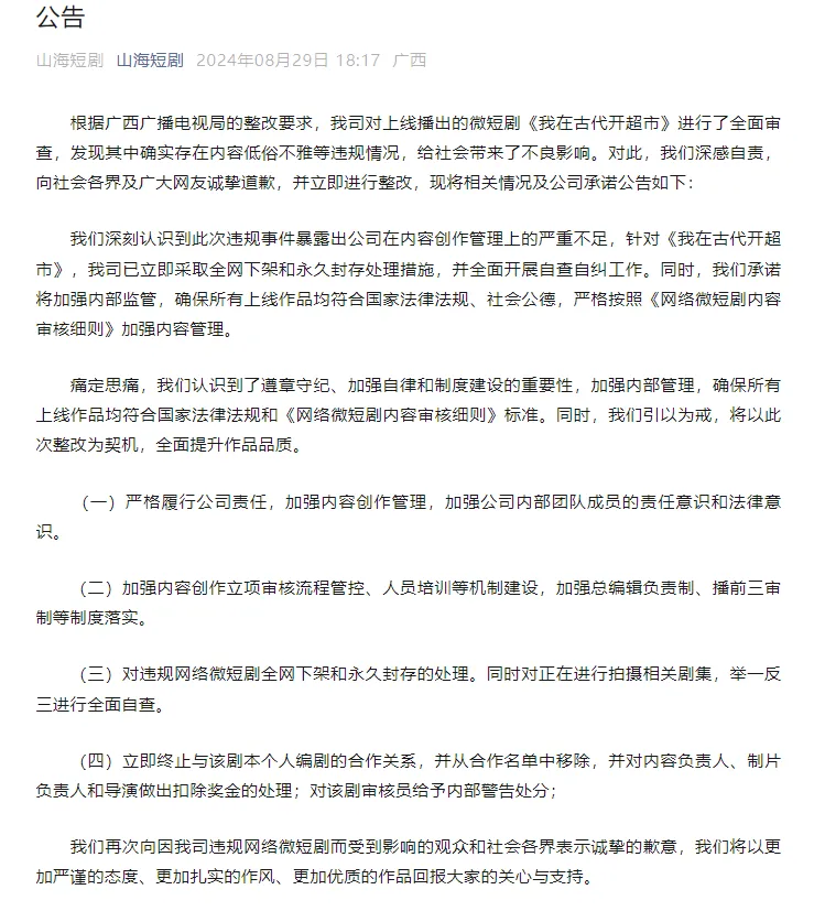 广西山海星辰文化传媒有限公司发布公告称,根据广西广播电视局的整改要求,公司对上线播出的微短剧《我在古代开超市》进行了全面审查,发现其中确实存在内容低俗不雅等违规情况,给社会带来了不良影响。该公司称,对此深感自责,向社会各界及广大网友诚挚道歉,并立即进行整改。