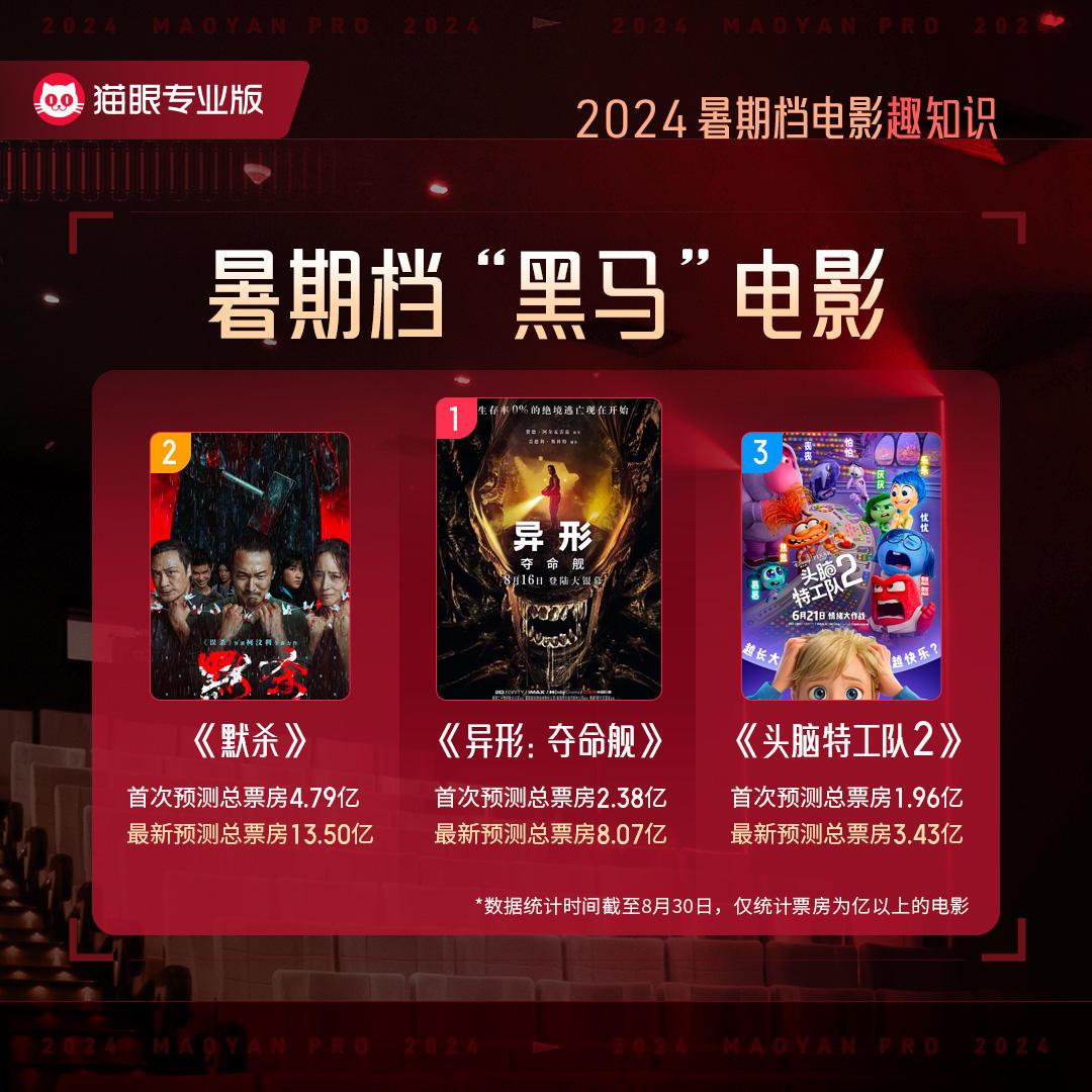 今年暑期档票房及观影人次相较去年同期下滑明显。档期内仅有两部影片取得10亿以上的票房。其中,《抓娃娃》以超过32亿的票房成为今年暑期档票房冠军,同时也打破了中国影史暑期档喜剧片的票房纪录,目前暂列年度票房榜的第三名。档期内第二名为《默杀》,票房超13亿,也是今年截至目前悬疑、犯罪类型片的票房冠军。第三名为进口片《异形:夺命舰》,票房突破6亿,成为今年暑期档末期的一匹“黑马”。第四、五名分别为《云边有个小卖部》和《死侍与金刚狼》。