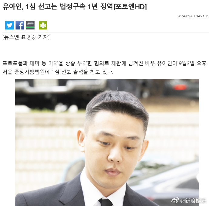 首尔中央地方法院3日以吸食大麻等罪名,一审判处刘亚仁有期徒刑一年,并处罚金200万韩元。