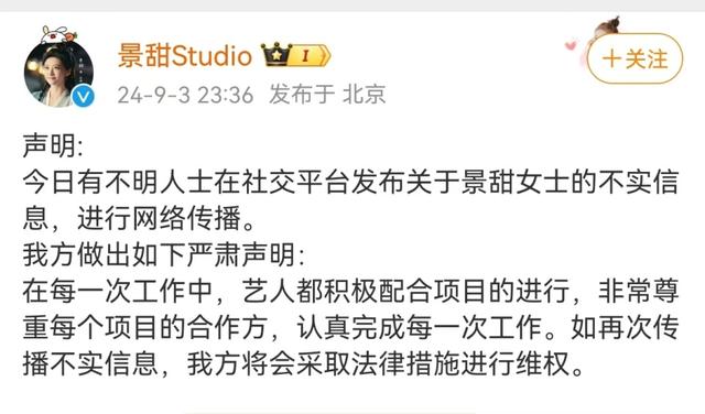 9月3日深夜 ,@景甜Studio 发布声明称,今日有不明人士在社交平台发布关于景甜女士的不实信息,进行网络传播。