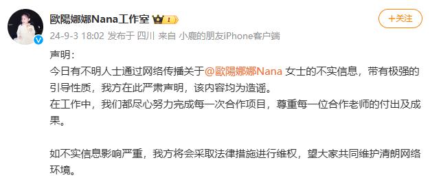 今日有不明人士通过网络传播关于欧阳娜娜女士的不实信息,带有极强的引导性质,我方在此严肃声明,该内容均为造谣。