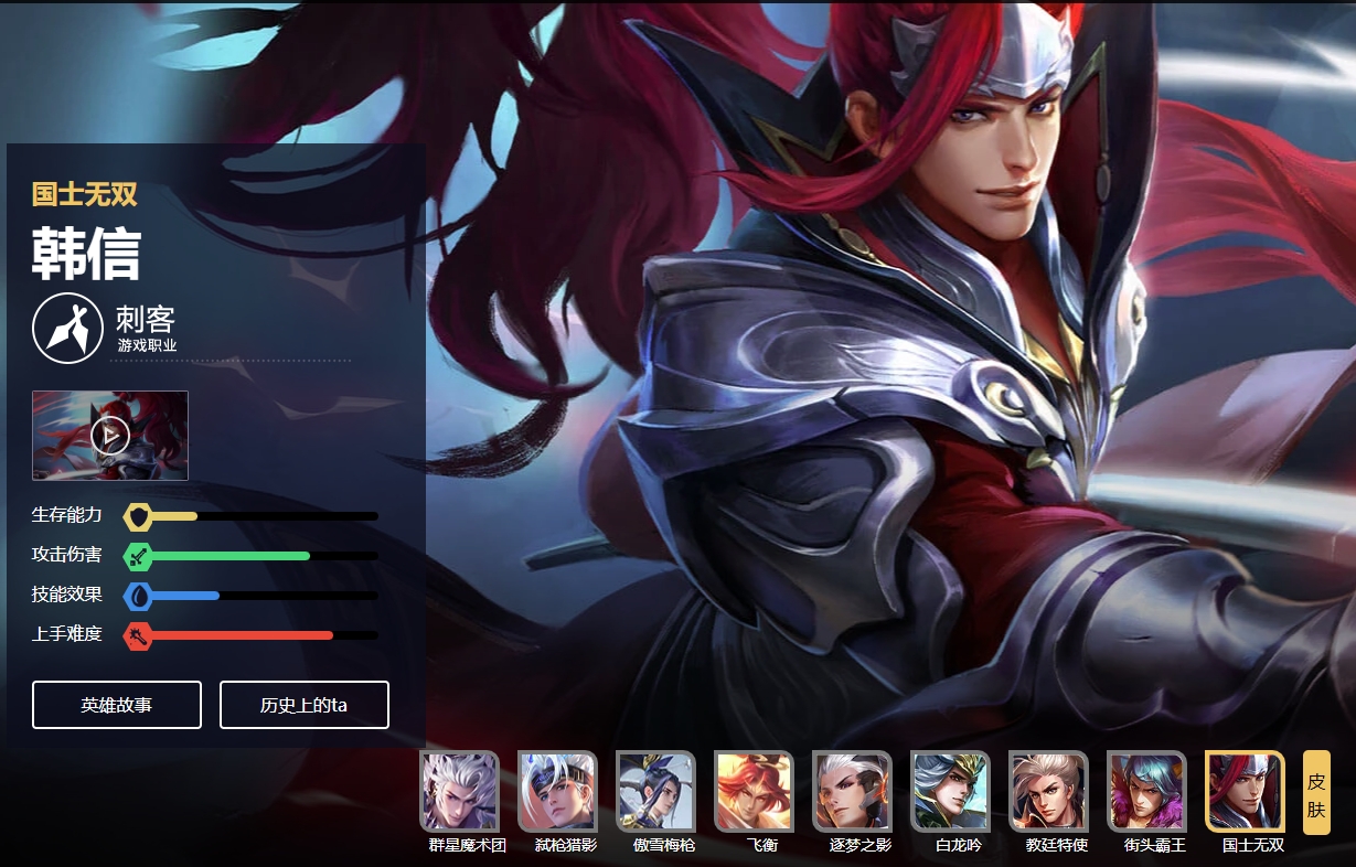 在《王者荣耀》官网的英雄介绍中,韩信在游戏中的角色是一名刺客,武器是一把银色长枪。