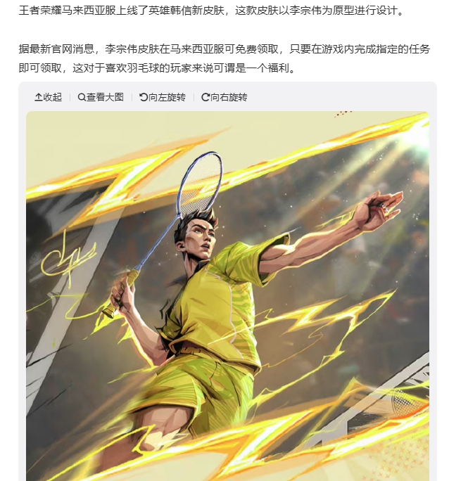 近日,热门手游《王者荣耀》又实现了与体育明星的联动。据网友爆料,这次的联动对象是来自马来西亚的羽毛球传奇人物李宗伟。