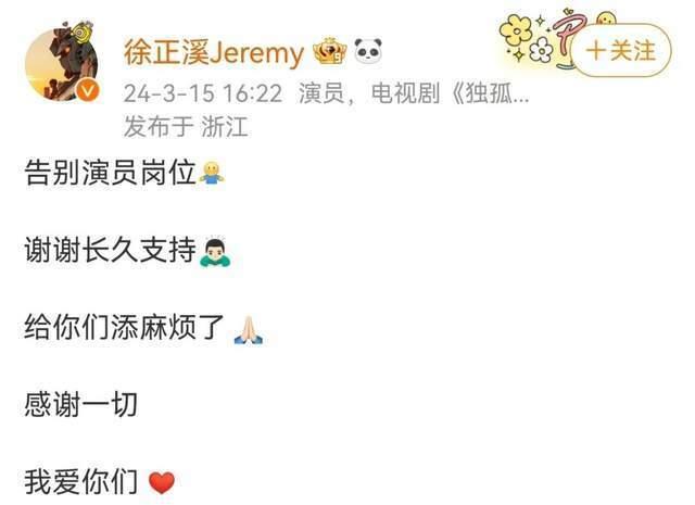 今年3月15日,徐正溪突然发文官宣退圈,他称“告别演员岗位,谢谢长久支持,给你们添麻烦了,感谢一切,我爱你们。”并在评论区补充:“会完成手头上的目前接纳的工作。”