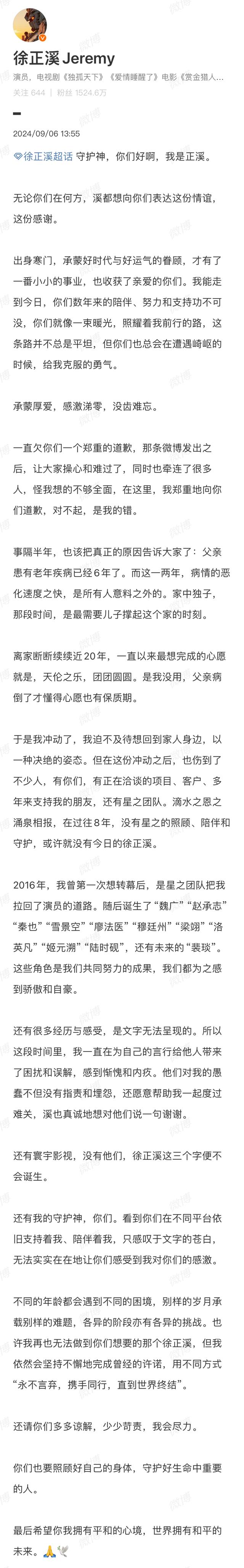 在长文中,徐正溪谈近期心境,向粉丝道歉,并透露“退圈”是由于父亲病情恶化:“我迫不及待想回到家人身边,以一种决绝的姿态。”