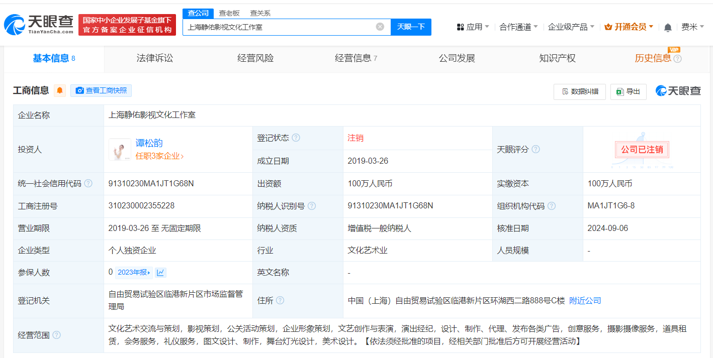 该工作室成立于2019年3月,投资人为谭松韵,出资额100万人民币,经营范围含文化艺术交流与策划、影视策划、公关活动策划、企业形象策划、文艺创作与表演、演出经纪等,为谭松韵个人独资企业。目前,谭松韵关联的3家工作室均为注销状态。