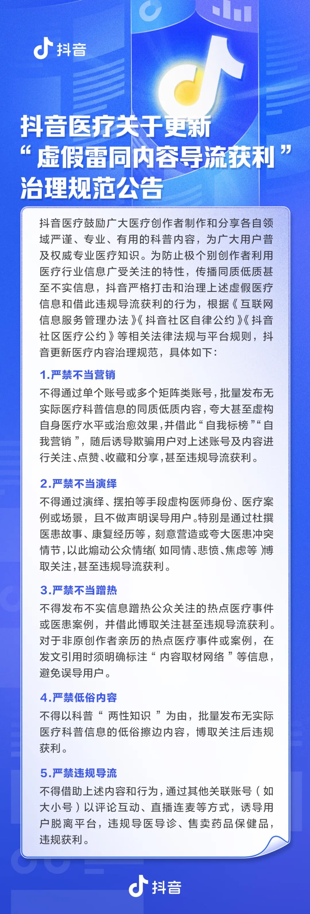 为了更好地服务广大创作者和用户,让大家通过短视频记录、分享和学习权威医疗科普知识,抖音医疗发布新规,从严治理“虚假雷同内容导流获利”。具体包括,“不得夸大甚至虚构自身医疗水平,打造‘神医’‘名医’人设诱导欺骗用户,违规获利。”