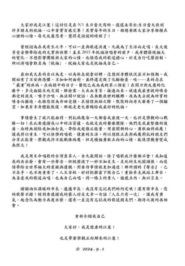 江蕙在声明中透露,2015年演唱会前夕自己发现身体有所变化,不想影响团队也不愿意歌迷担心,于是自行吃药控制,当时的演唱会取名为“祝福”既是祝福大家也是祝福自己。最初江蕙以为休息一阵子身体会好转,但身体状况不如预期,“在开刀与反复的化疗中,多次面临生死交关,肺栓塞、大出血等等”,就连她最重视的嗓音都受到波及,沙哑、无法开口说话。现在江蕙身体已经好转,她也宣布将在10月5日在台北大巨蛋登台演出。