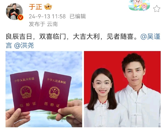 于正发文恭喜吴谨言洪尧:“良辰吉日,双喜临门,大吉大利,见者随喜。”