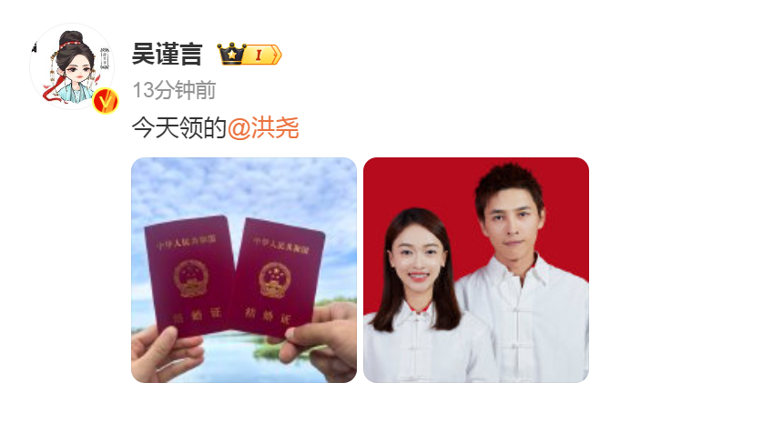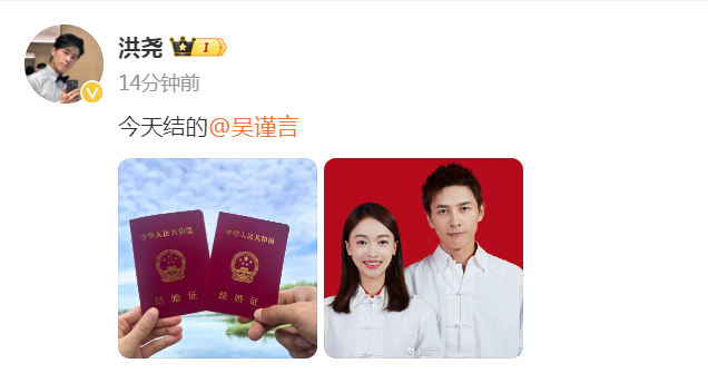 9月13日,演员吴谨言、洪尧在微博上晒出结婚证,配文:“今天领的”“今天结的”。