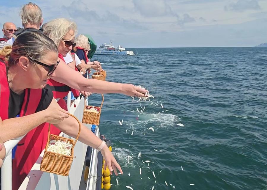 2024年6月18日,“里斯本丸”号盟军战俘后人在浙江舟山纪念沉船营救事件。新华社记者 于艾岑 摄