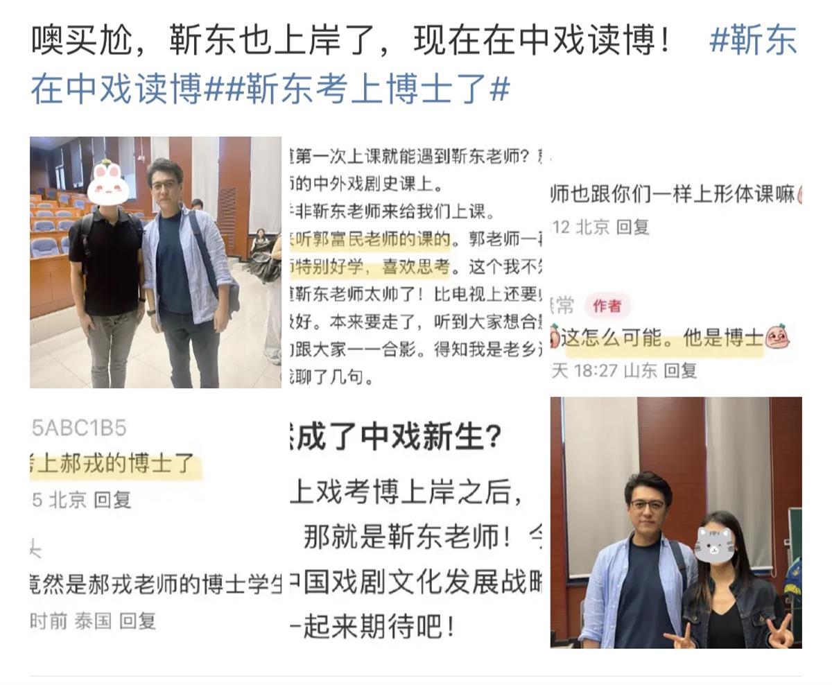 8月履新中国煤矿文工团团长的靳东,又考上了中央戏剧学院的博士?近日,多位网友晒出照片,称在中戏上课时偶遇“同窗”靳东,透露他已经考上中戏博士。靳东的粉丝闻讯与有荣焉,“当着团长、演着话剧电视剧、读着博士、出席各种活动,我哥已经next level了!”