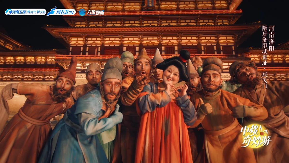 舞蹈节目《胡俑狂欢夜》中,“胡俑”们在一个月圆之夜“苏醒”了过来。他们在地铁车厢里与少年们斗舞,跟着旅客来到洛邑古城,还与唐美人俑来了一次奇妙之旅……路红莉介绍称,导演组从河南省博物院、甘肃省博物院、商丘博物馆、大英博物馆等馆藏的胡俑中寻找灵感,结合小品和舞蹈,力图生动展现唐三彩非遗文化和大运河文化的魅力。