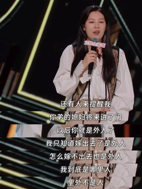 唐香玉上台讲“催婚”,说家里“从小就给我预设了一个婆家”,调侃自己怎么“嫁出去了是外人,嫁不出去也是外人,我到底是哪里人,里外不是人”。