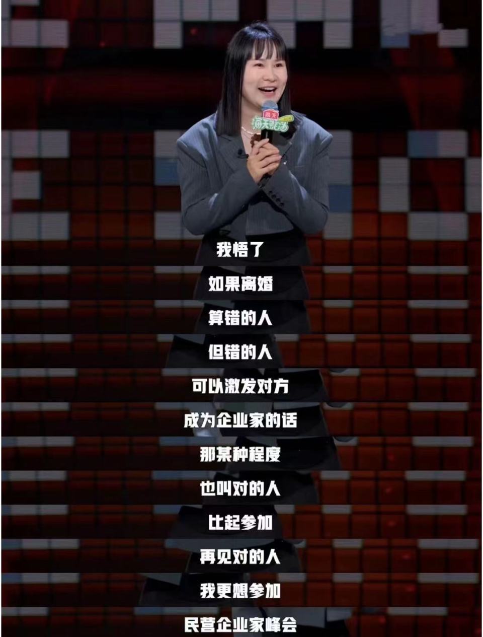 她的话题再也不是总是围着老公打转——即使老公依然出现在她的文本中,但核心已经变成她个人关于生活的感受,她说:“我觉得,女人慕强不如变强。”在调侃完离婚恋综与婚姻生活之后,已成为一名脱口秀俱乐部的主理人的步惊云毫不掩饰自己的野心:“比起参加《再见对的人》,我更想参加‘民营企业家峰会’。”
