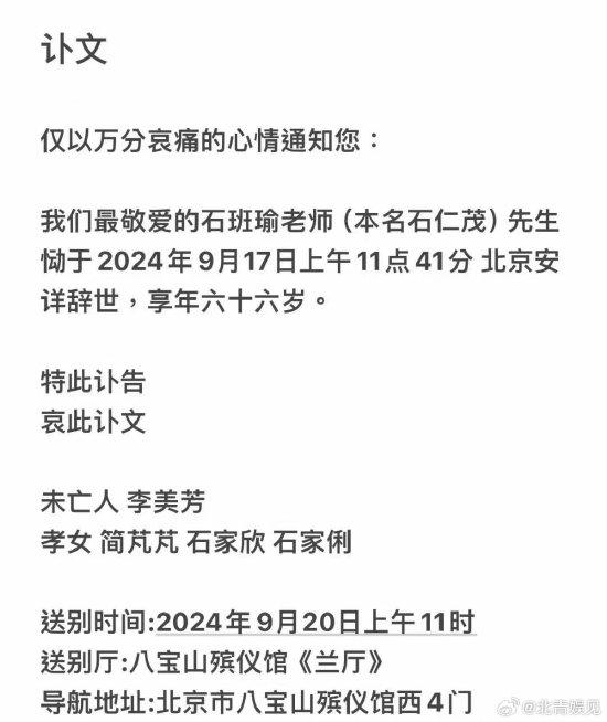 被称为”周星驰御用配音“的配音演员石班瑜于9月17日上午在北京去世,享年66岁,将于9月20日上午11时举行遗体告别仪式。