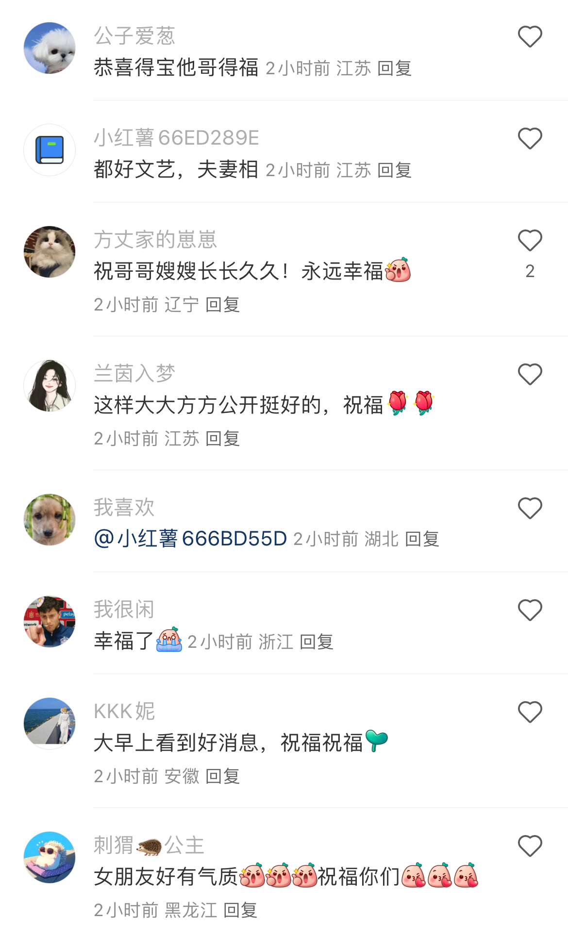 消息一经公开,引众网友点赞祝福,有网友还表示二人很有夫妻相。截至发稿,该帖已获2.5万点赞。