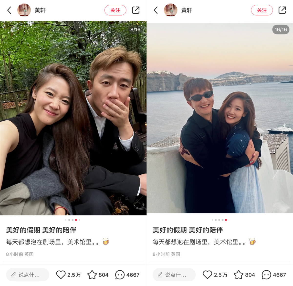 9月21日凌晨,演员黄轩在社交平台晒出两张与女友的亲密出游照,并配文:“美好的假期 美好的陪伴 每天都泡在剧场里,美术馆里…”