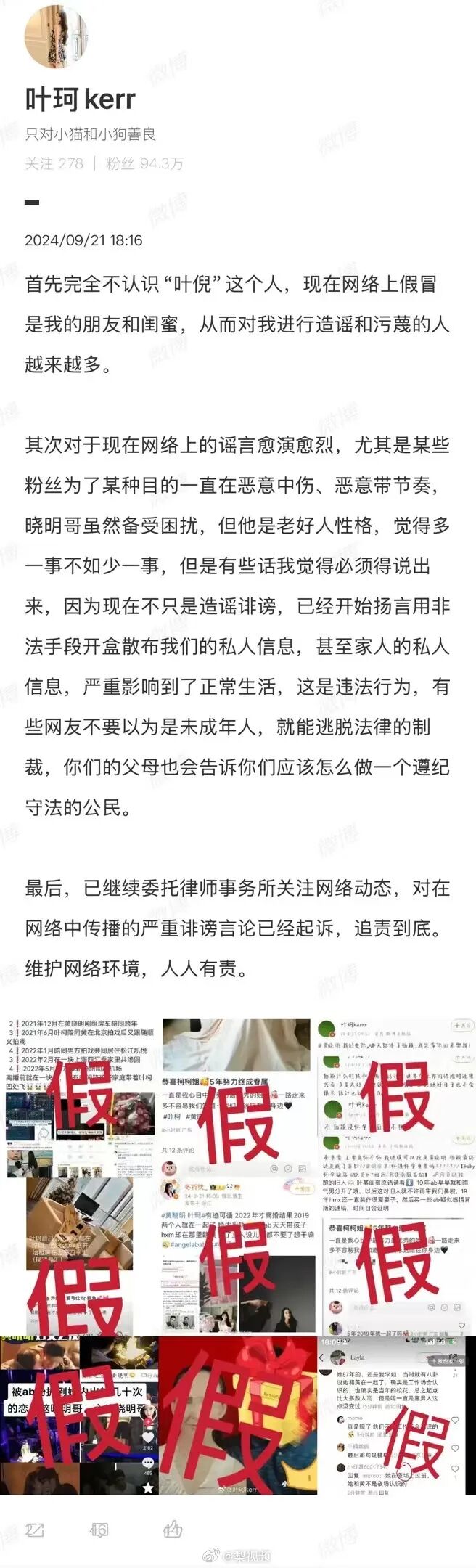 9月21日,@叶珂kerr紧急发文,打假“叶倪”。她表示完全不认识“叶倪”这个人,现在网络上假冒是她的朋友和闺蜜从而进行造谣和污蔑的人越来越多。她已继续委托律师事务所关注网络动态,对在网络中传播的严重诽谤言论已经起诉,追责到底。此外,她还晒图否认了黄晓明婚内出轨的传言。