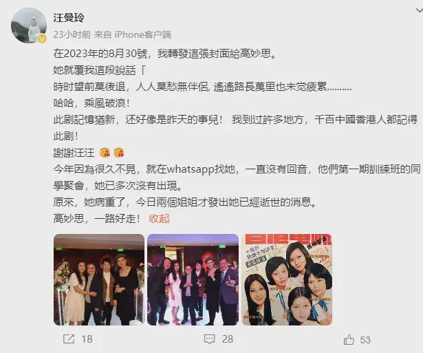 汪曼玲表示因为与高妙思很久没见面,所以与她联系,却一直得不到对方回复,“他们第一期训练班的同学聚会,她已多次没有出现。原来,她病重了,今日两个姐姐才发出她已经逝世的消息。高妙思,一路好走。”据知高妙思逝世前曾说因睡眠质素差,令她日渐消瘦。