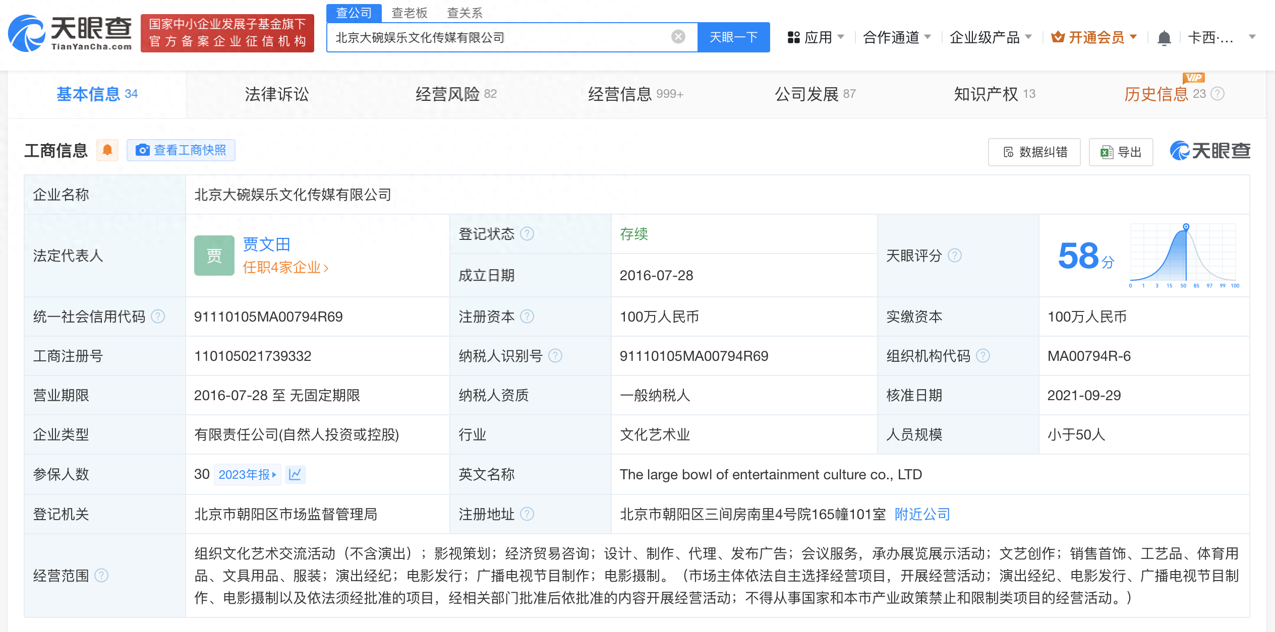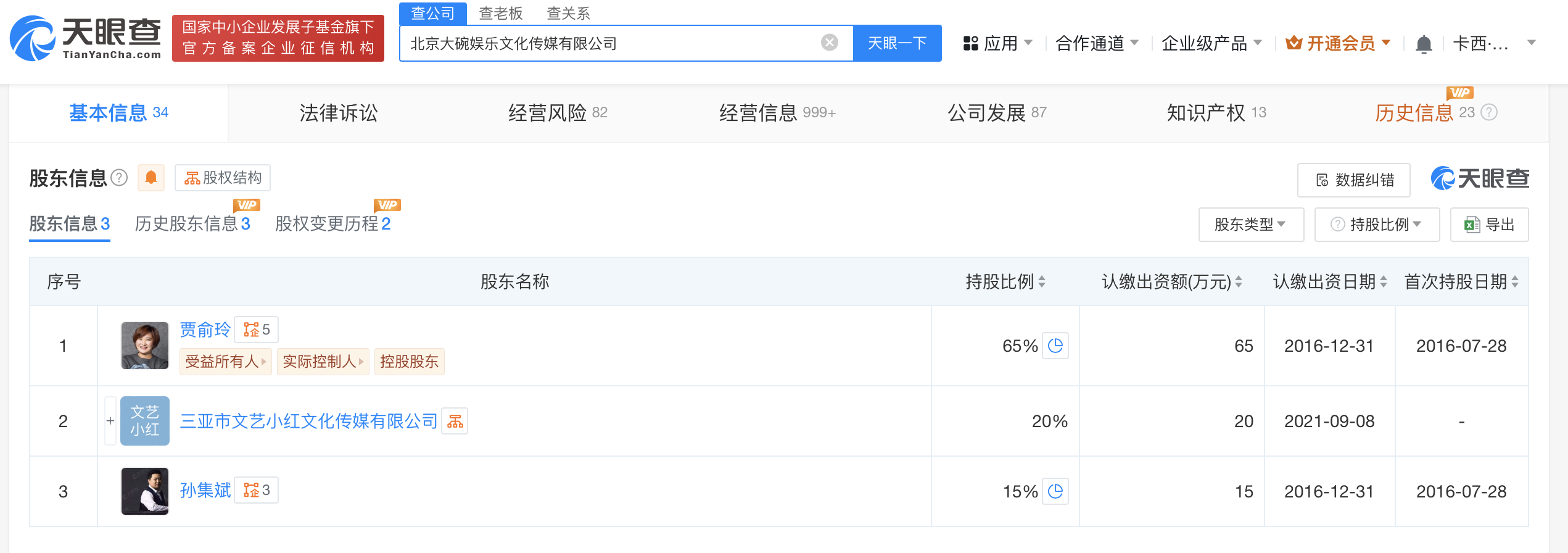 9月27日,大碗娱乐发布业务调整说明,公司旗下艺人张小斐、许君聪、卜钰、何欢、张泰维、朱天福、曹贺军、刘宏禄的经纪合约已到期,将不再续约,未来会换一种形式继续合作。贾玲未来将继续专注内容创作,不再担任公司职务。天眼查App显示,北京大碗娱乐文化传媒有限公司成立于2016年7月,法定代表人、董事长为贾玲父亲贾文田,注册资本100万人民币,经营范围含组织文化艺术交流活动、影视策划、经济贸易咨询、文艺创作、演出经纪、电影发行等。股东信息显示,该公司由贾俞玲(艺名贾玲)、三亚市文艺小红文化传媒有限公司、孙集斌共同持股,贾俞玲为受益所有人。目前,贾俞玲名下仅上述1家公司为存续状态。