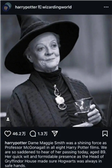 △《哈利·波特》官方在社交媒体发文悼念玛吉·史密斯
