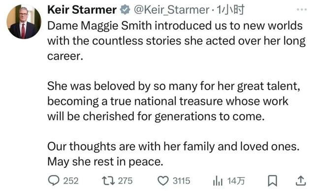 英国首相基尔·斯塔默发文缅怀,“玛吉·史密斯在漫长的演艺生涯中为我们带来了无数精彩的角色,她因伟大的作品受到很多人的喜爱,她是真正的国宝,我们的心与她的家人同在”。
