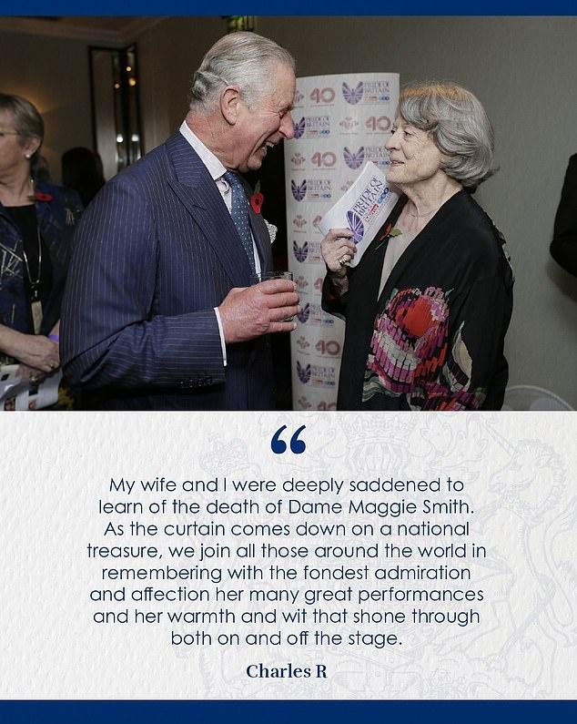 英国国王查尔斯三世发表声明悼念玛吉·史密斯并附上合影。图自英媒