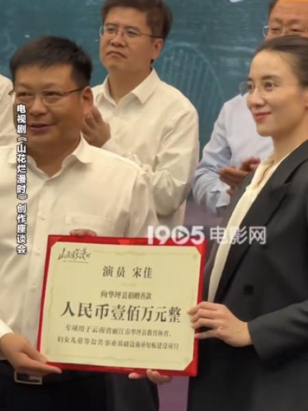 9月27日,据CCTV6电影频道官方新媒体1905电影网消息,在电视剧《山花烂漫时》的创作座谈会上,宋佳向华坪县捐赠100万元人民币,《山花烂漫时》剧组向华坪县捐赠600万元。