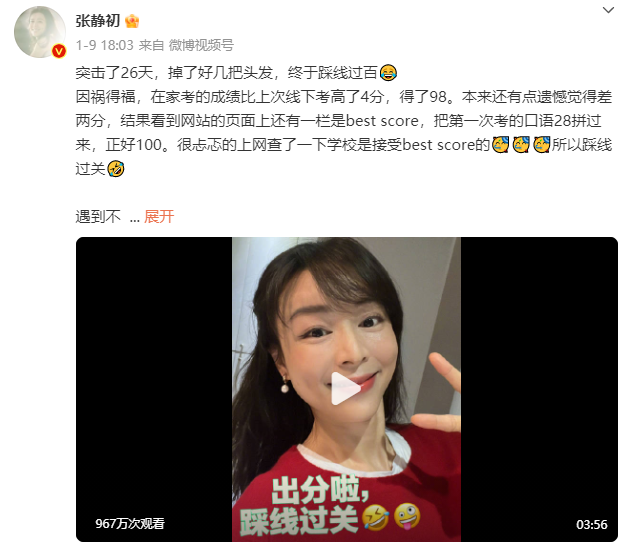张静初本人也跟观众们分享了这个好消息,网友们都恭喜她,戏称她是内娱直播考研上岸第一人。