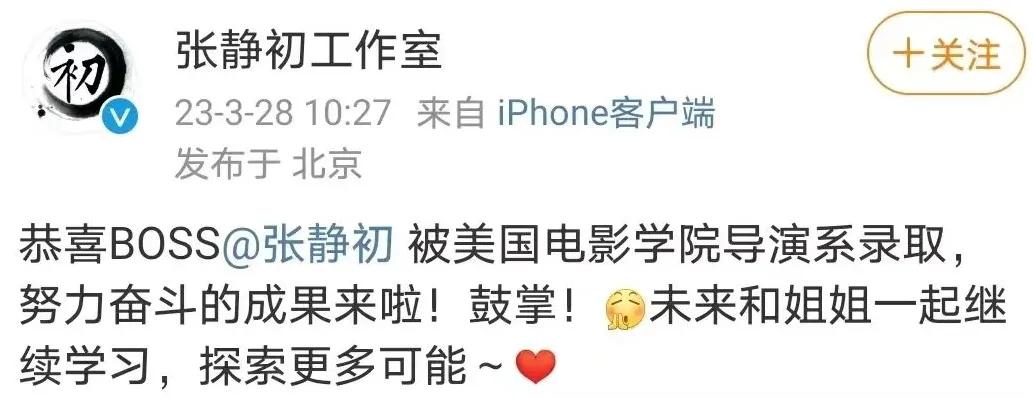 去年3月,张静初工作室曾公开消息称,张静初已被美国电影学院导演系录取。