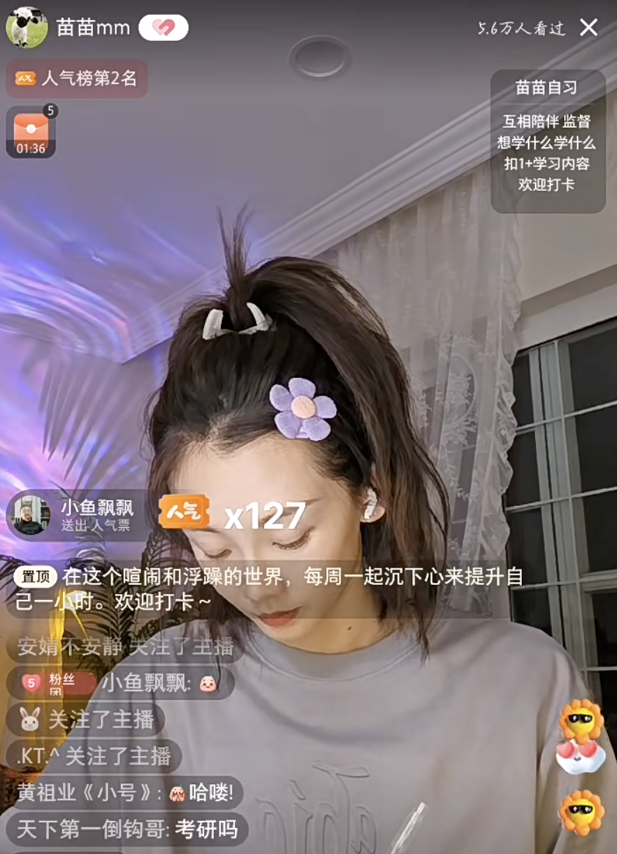 自习晚上9点开始,8点50苗苗就会打开直播间做准备,顺便跟大家聊两句,9点开始就进入自习模式,大家就相互不说话也不打扰了。