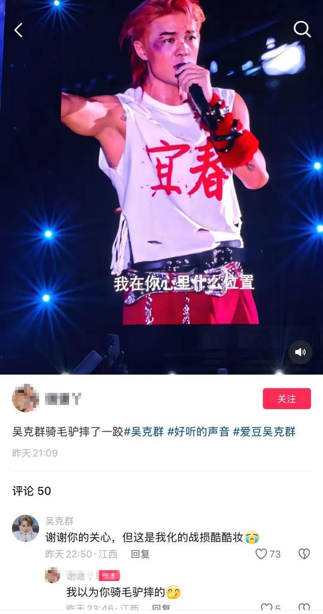 随后,吴克群本人现身评论区表示自己并未摔跤,脸上的伤痕是当日的妆容设计。