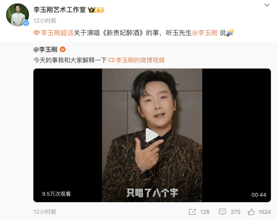 10月4日晚间,针对网友提出的“李玉刚在许嵩演唱会上划水”的争议,李玉刚在社交平台发视频回应称:演唱新贵妃醉酒的初衷就是想让现场嗨一点,多和大家互动一下。如果没有达到大家的诉求和满意,在这里和大家说一声抱歉。接下来的杭州演唱会,自己会唱一首十分钟版的新贵妃醉酒。