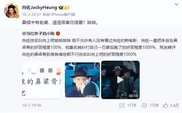 10月2日,向佐转发吐槽他这个动作好笑的微博回应:“鼻梁中有老婆,这个答案你满意?哈哈。”