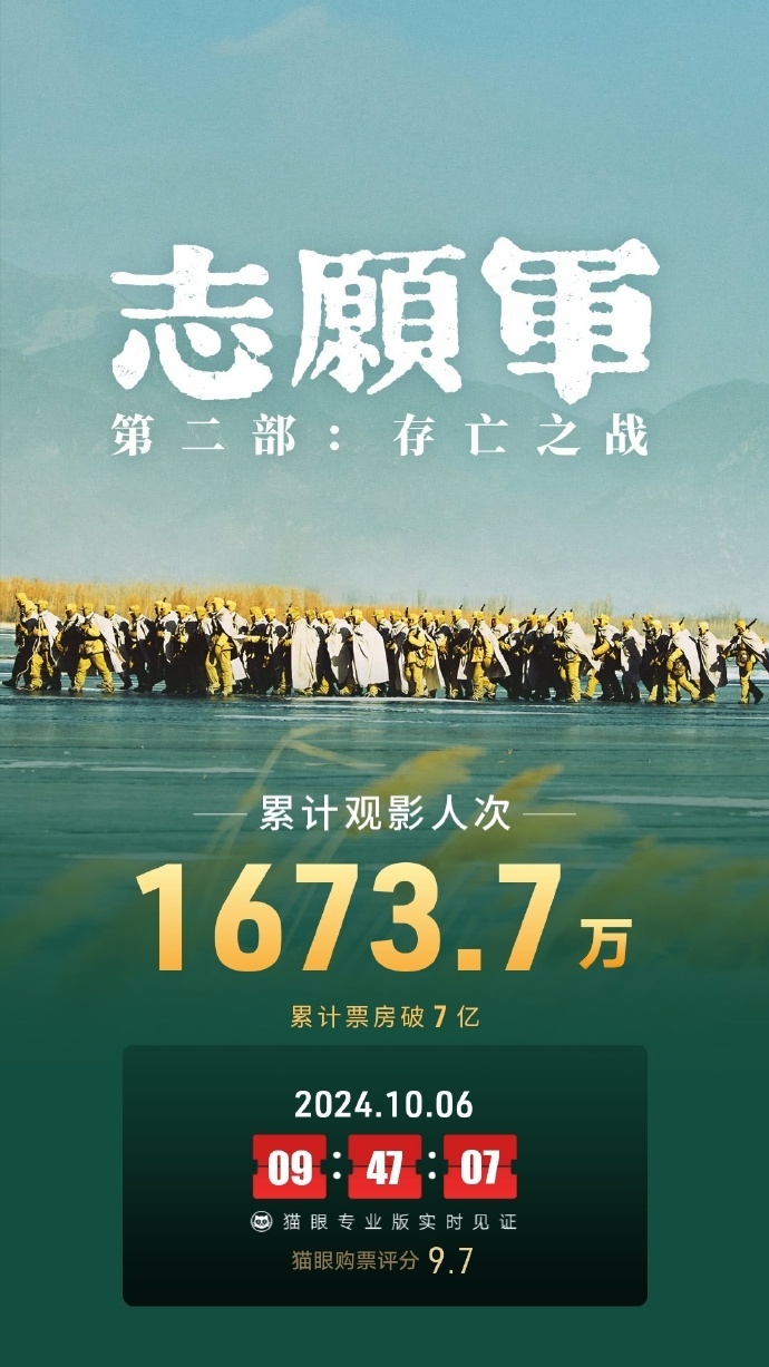 据猫眼专业版数据,电影《志愿军:存亡之战》上映7天,总票房破7亿。
