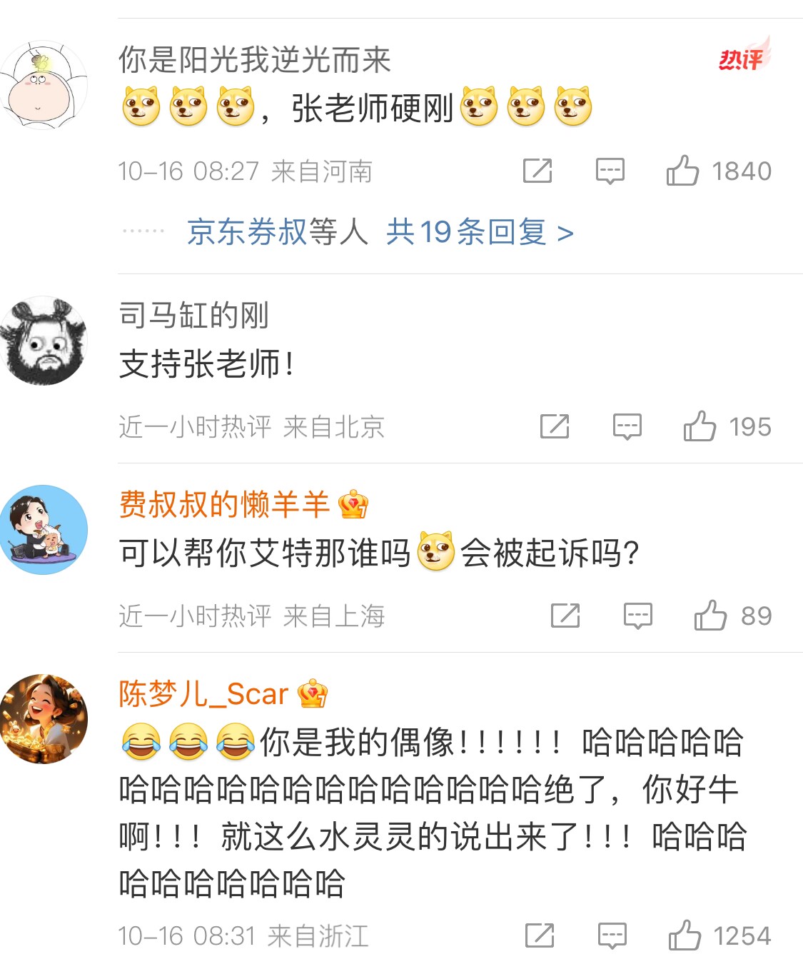 不少网友表示“张老师,慎言”“张老师硬刚”,也有网友称“你说出了我不敢说的话”,但也有网友这样的用词表达有些许激烈。