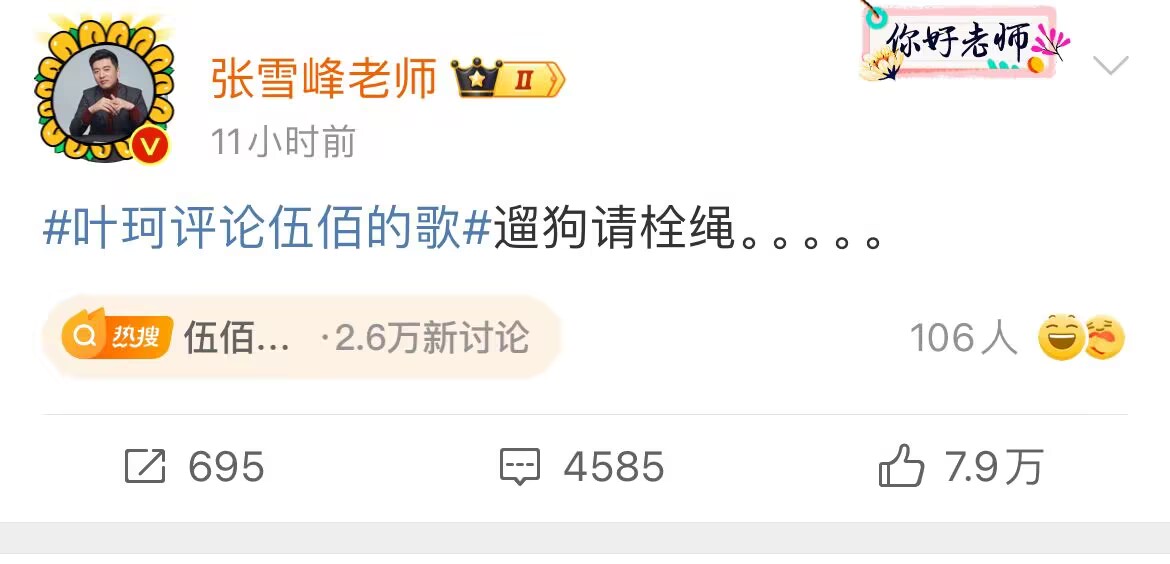 16日早,网红张雪峰发博称:遛狗请栓绳,并带上了“叶珂评论伍佰的歌”的话题,疑似怒怼叶珂,为伍佰撑腰。