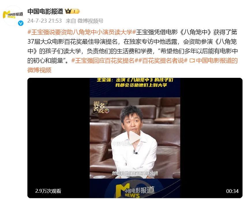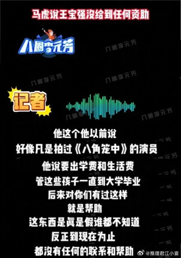 2023年,王宝强拍摄的电影《八角笼中》票房达到22亿,当时王宝强在采访中说,参演电影的孩子们,自己会资助他们到大学毕业。该账号声称,王宝强为了电影票房承诺做慈善,但私下并未兑现。其中一名参演电影的小演员马虎接受采访时说,“关于王宝强所说的资助,到现在为止也沒有任何的联系和帮助”。