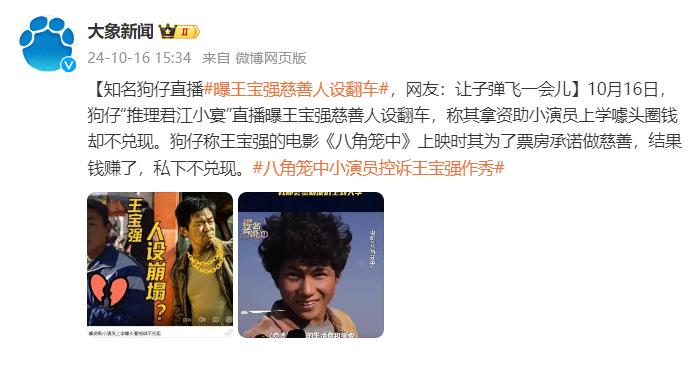 据媒体报道,10月16日,有娱乐博主直播曝王宝强“慈善人设翻车”,称其拿“资助小演员上学”做宣传,却不兑现。
