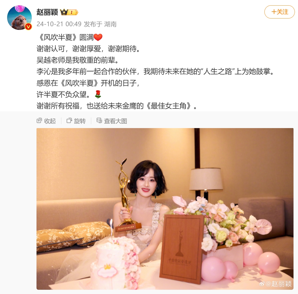 获奖后,赵丽颖深夜发文:《风吹半夏》圆满,谢谢认可,谢谢厚爱,谢谢期待。吴越老师是我敬重的前辈。李沁是我多年前一起合作的伙伴,我期待未来在她的“人生之路”上为她鼓掌。感恩在《风吹半夏》开机的日子,许半夏不负众望。谢谢所有祝福,也送给未来金鹰的《最佳女主角》。