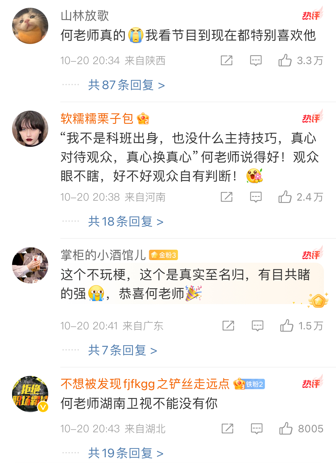 对此,很多网友在评论区送来祝福“这个是真的实至名归”“内娱不能没有何老师”“全世界最好的何老师”。
