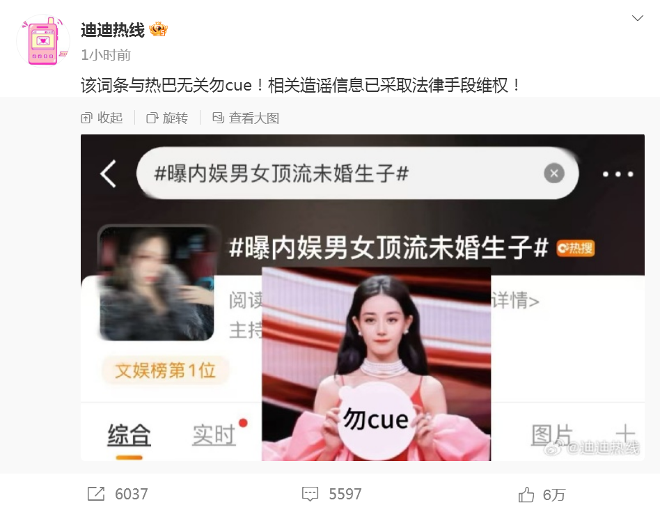 当晚21时30分,迪丽热巴方 回应:“该词条与热巴无关勿cue!相关造谣信息已采取法律手段维权!”